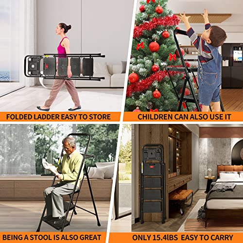 WNOEY 4 Step Ladder, Folding Step Stool with Tool Platform, Wide Anti-Slip Pedal, Lightweight 500lbs Step Ladder for Adults, Portable Steel Step Stool for Adults, Black