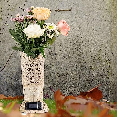 Solar Memorial Cemetery Flower Vase with LED for Fresh/Artificial Cemetery Grave Decorations Angel Statue Vase with Spikes Gravestone Decor