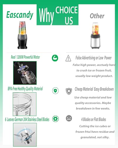 Eascandy Real 900W Watts Smoothie Blender for Shakes and Smoothies, 7 in 1 Set Personal Blender, Germany 3D Stainless Steel 6-Leaves Blades Smoothie Maker with 2 Pieces 24 OZ Tritan Sport Cups, Black, Elite 7 in 1 Set Item Sku: